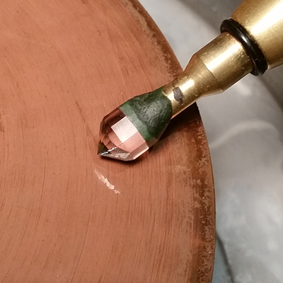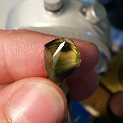 Cutting the pavilion was straight forward with the meets coming together nicely. I had a fair bit of material to remove so I started on the 360 grit lap (very coarse) to remove most of the junk I didn’t need. I pulled everything together with the 3000 grit copper lap and everything was falling into place nicely. Finally it was time to polish. I got the type metal lap out, charged it up with a little bit of 50,000 grit diamond powder and started to polish. I noticed that there was small scratches in the facets so I thought to myself that I needed to try a different polishing technique. I pulled out the ultra lap and polished up one of the facets. What do you know, a beautiful smooth polish. Thank god for the ultra lap!
