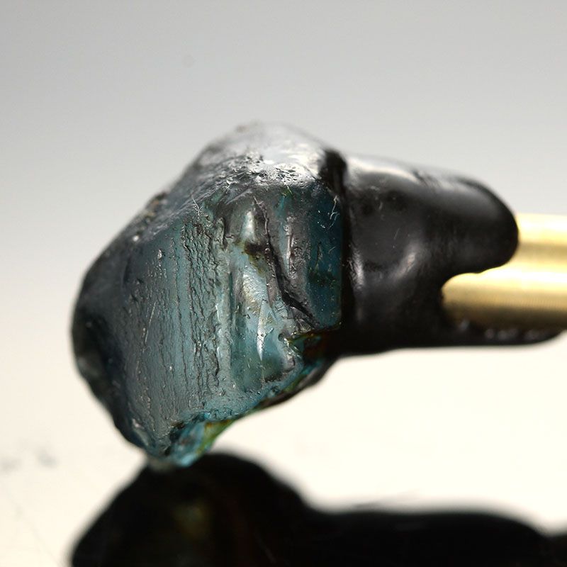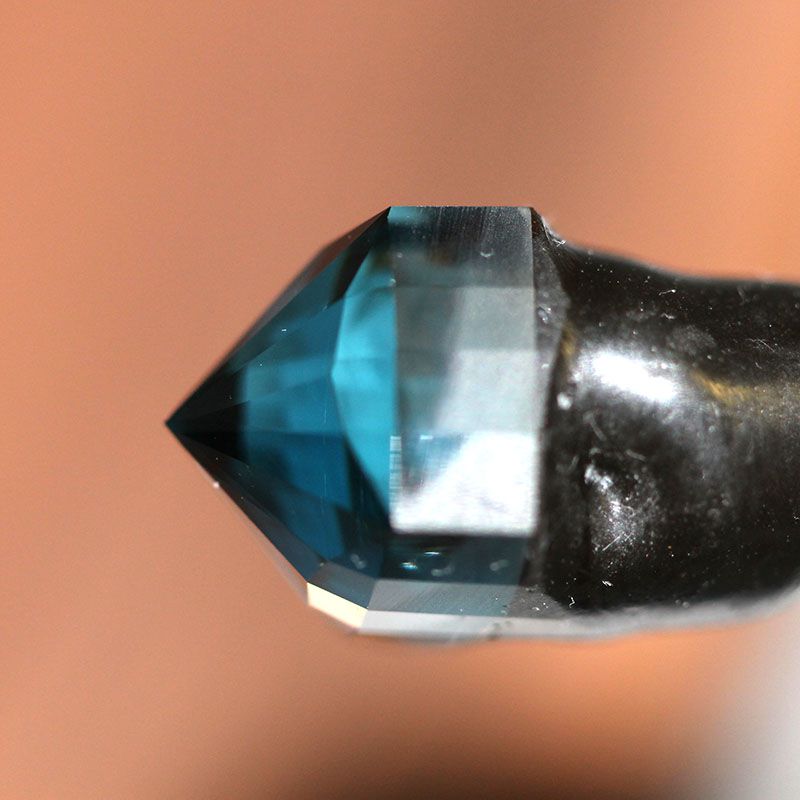 Topaz is a beautiful gemstone that is most commonly seen in jewellery as a light blue sky blue. Topaz is one of the gemstones that is almost always treated and the treatment is widely accepted. Topaz is generally colourless, light brown or light blue when it is mined out of the ground and is then usually treated via irradiation, which induces the beautiful blue colour in the gem. There are three common blue colours; Sky blue , Swiss blue and the darkest colour, London blue.The piece of rough that I started with was a London blue Topaz with a nice flash of green. The shape of the rough told me it wanted to be cut as a square shaped stone.
